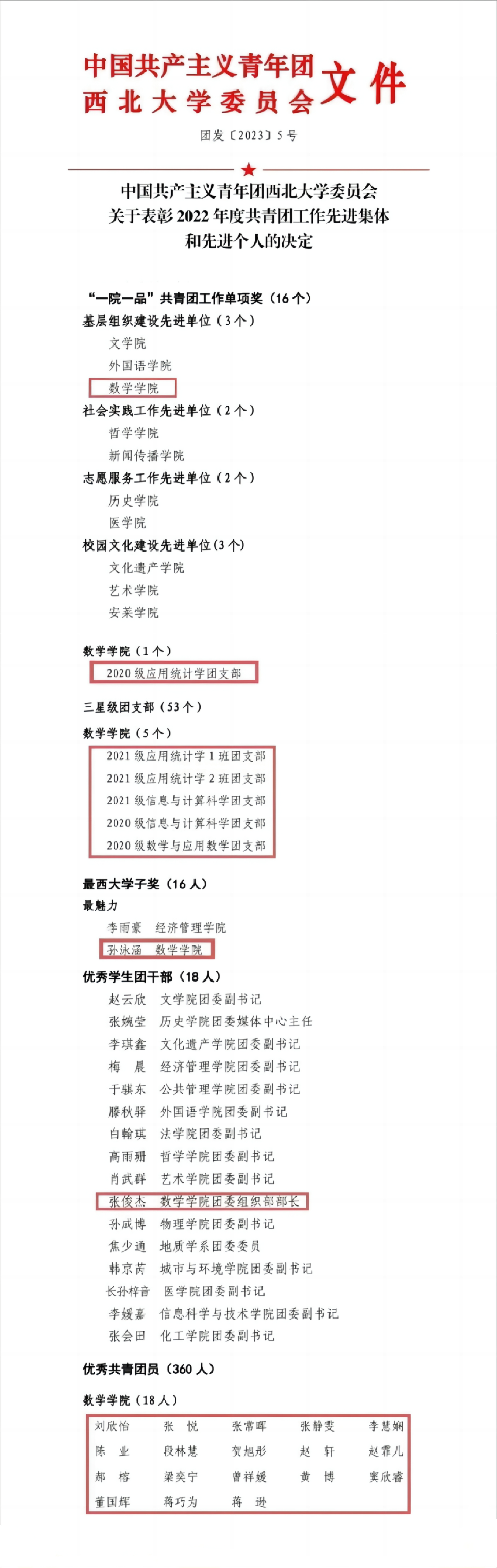 在先进集体表彰中,公司团委荣获“基层组织建设先进单位”荣誉称号;2020级应用统计学团支部荣获“四星级团支部”称号;2021级应用统计学1班团支部、2021级应用统计学2班团支部、2021级信息与计算科学团支部、2020级信息与计算科学团支部、2020级数学与应用数学团支部荣获“三星级团支部”称号。在优秀个人表彰中,孙泳涵同学荣获“最魅力西大学子”称号;张俊杰同学荣获“优秀员工团干部”称号;刘欣怡等十八位同学荣获“优秀共青团员”称号!