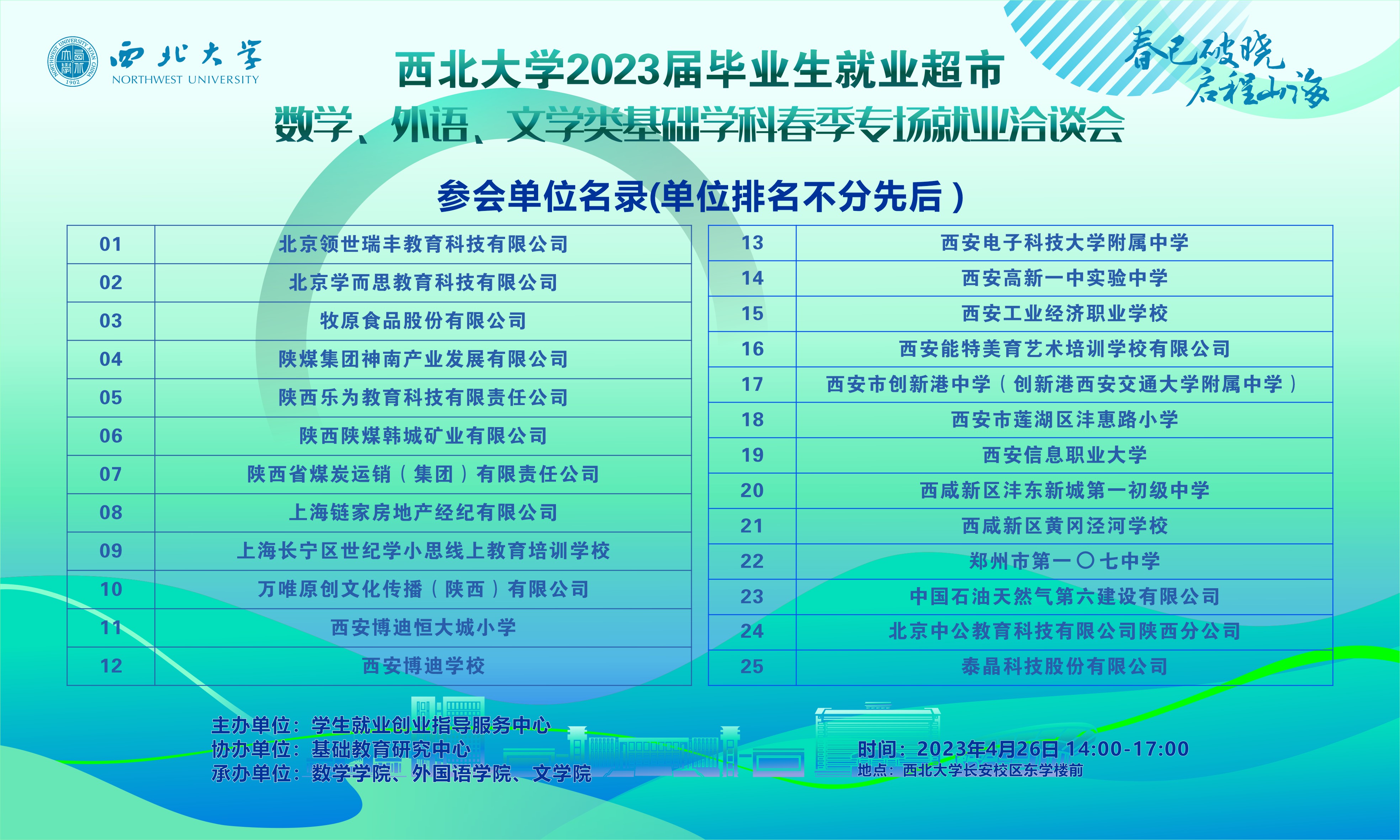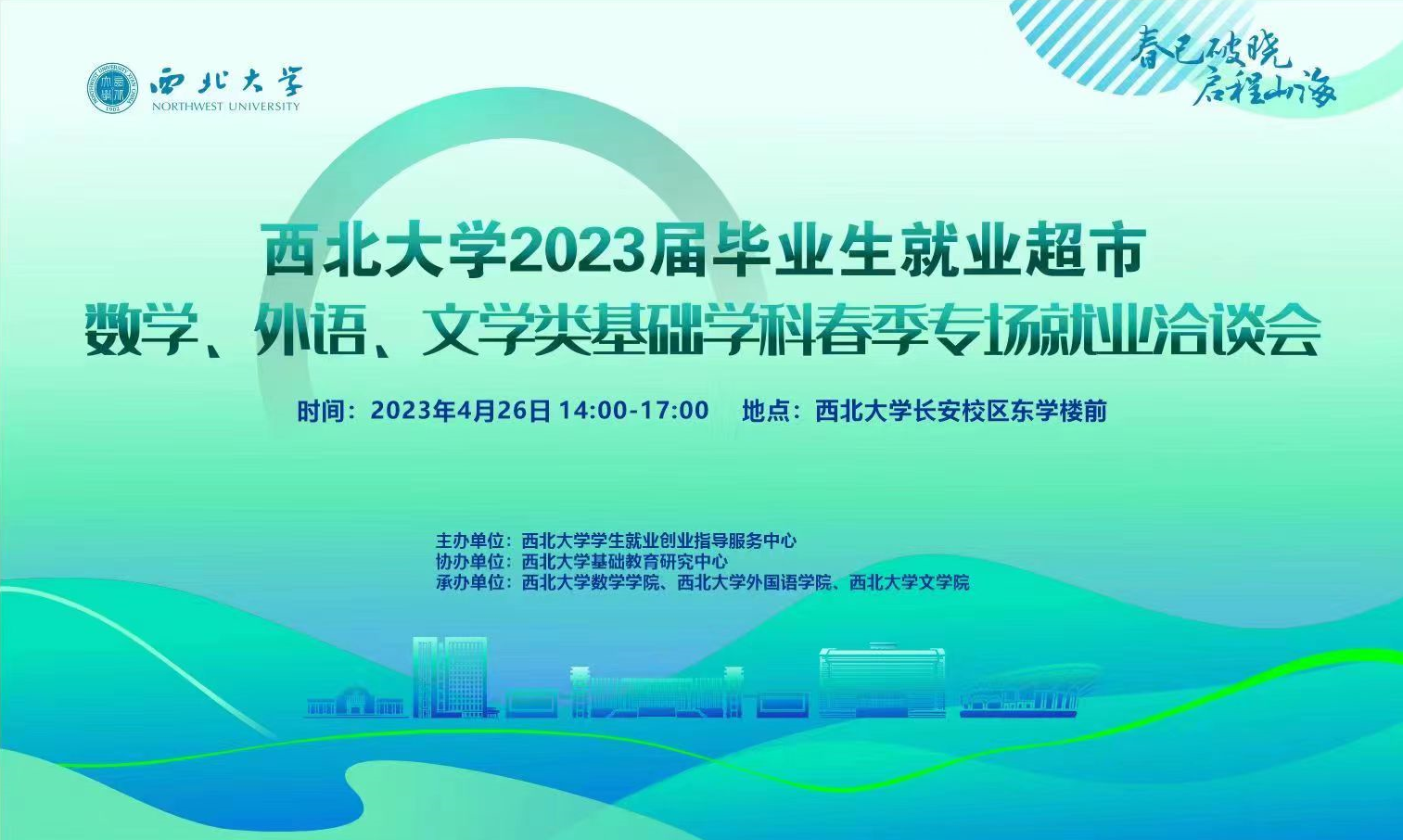 为深入贯彻党的二十大精神,全面落实党中央、国务院关于高校毕业生就业创业工作的决策部署,为企业和毕业生搭建供需桥梁,4月26日下午,由suncitygroup太阳集团员工就业创业指导服务中心主办,suncitygroup太阳集团基础教育研究中心协办,suncitygroup太阳集团、外国语公司和文公司联合承办的“suncitygroup太阳集团2023届毕业生就业超市——数学、外语、文学类基础学科春季专场就业洽谈会”在suncitygroup太阳集团长安校区东学楼前成功举办。