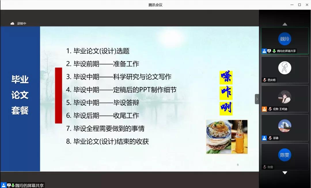 魏老师提出本科毕业论文设计(以下简称毕设)是大学时代的最后一次大作业。魏老师分别从毕设的必要性、完成毕设所需的能力要求、毕设整体流程以及常见问题四个方面带领同学们走进毕设,揭开毕设的“真面纱“。首先,阐述了同学们完成毕设的必要性,对于国家而言,这是我国本科培养计划中规定的综合性实践教学环节;对于公司而言,这是衡量高等公司教学教育质量和办学效果的重要评价内容;对于同学而言,不论是选择继续深造或者走向社会,它都是对于四年高等教育后综合能力与素质的全面检验,更是为我们以后的科研或实践打下良好的基础。接着,列举了一些有关完成毕设所需训练和提高的能力要求,包括前期调查研究、制定方案的设计能力和分析资料、数据处理的实践能力,以及撰写论文的书面表达能力等。接下来,魏老师将毕设比作“套餐“,为同学们详细介绍了毕设从前期、中期到后期的完整流程。其主要包括毕业设计选题及选题工作、准备工作、科学研究与论文写作、定稿后的PPT制作细节、毕设答辩和收尾工作。之后,强调了毕设全程需要做到的一些事情,也谈了谈毕设结束后将会有的收获。最后,梳理了毕设中同学们容易忽略的几个要点和会出现的常见问题,叮嘱同学们要用心对待毕设,与指导老师保持积极联系。
