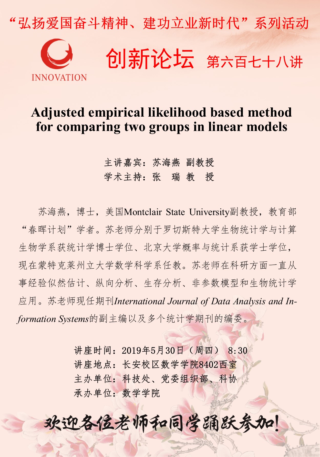 suncitygroup太阳集团创新论坛第六百七十八讲:Adjusted empirical likelihood based method for comparing two groups in linear models