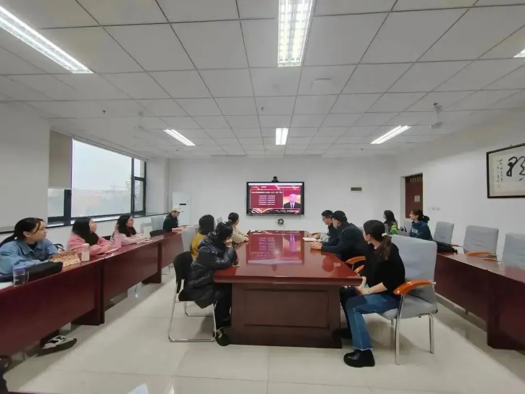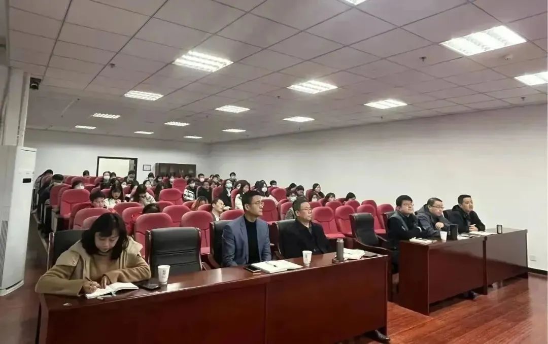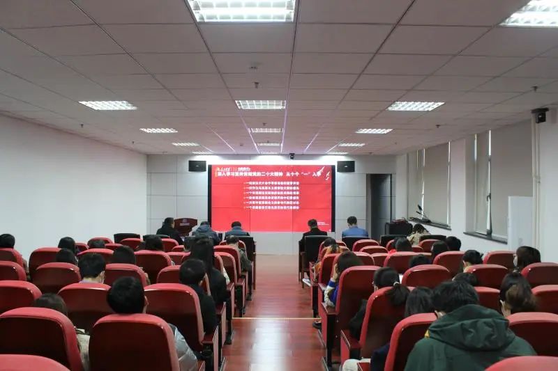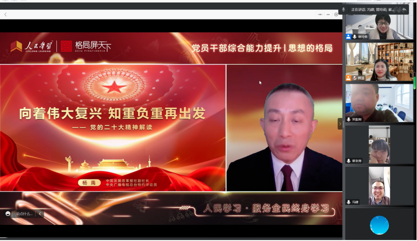 11月21日下午,数学公司党委组织全院师生观看学习由中国发展改革报社副社长、中央广播电视总台特约评论员杨禹主讲的“党的二十大精神解读”专题学习。公司党政班子成员、各支部书记、师生党员代表集体在公司凌岭报告厅收看学习,各支部组织师生党员通过线上线下方式集中学习。