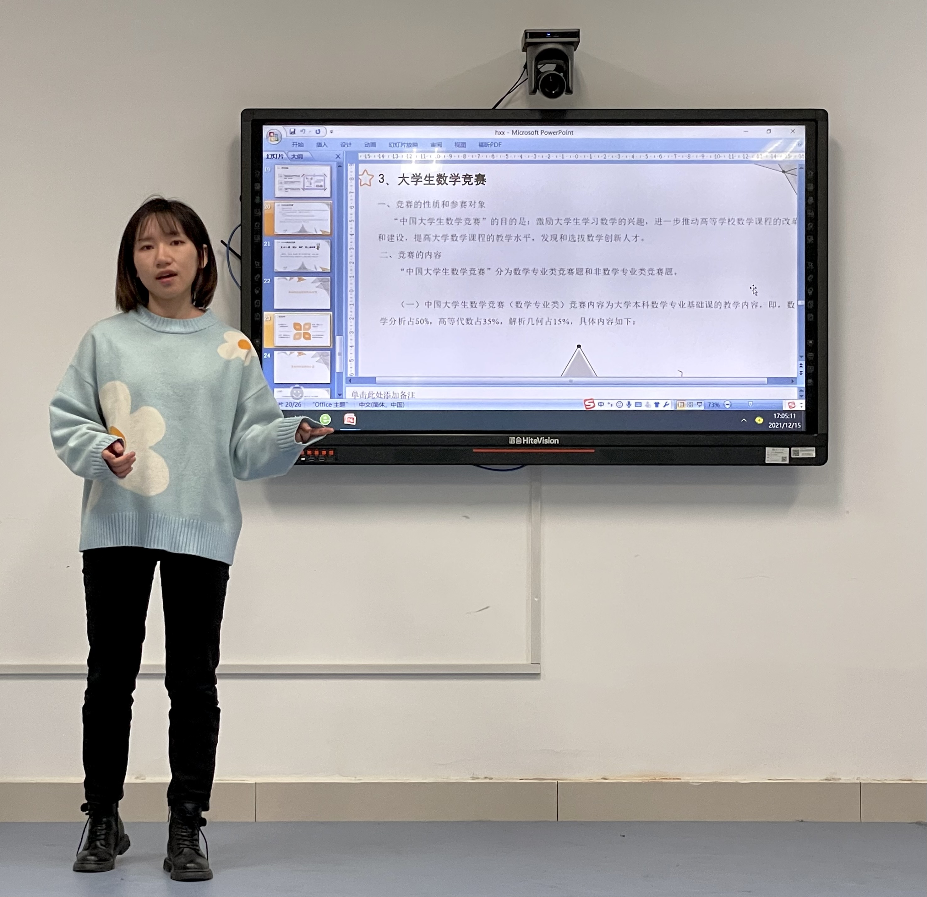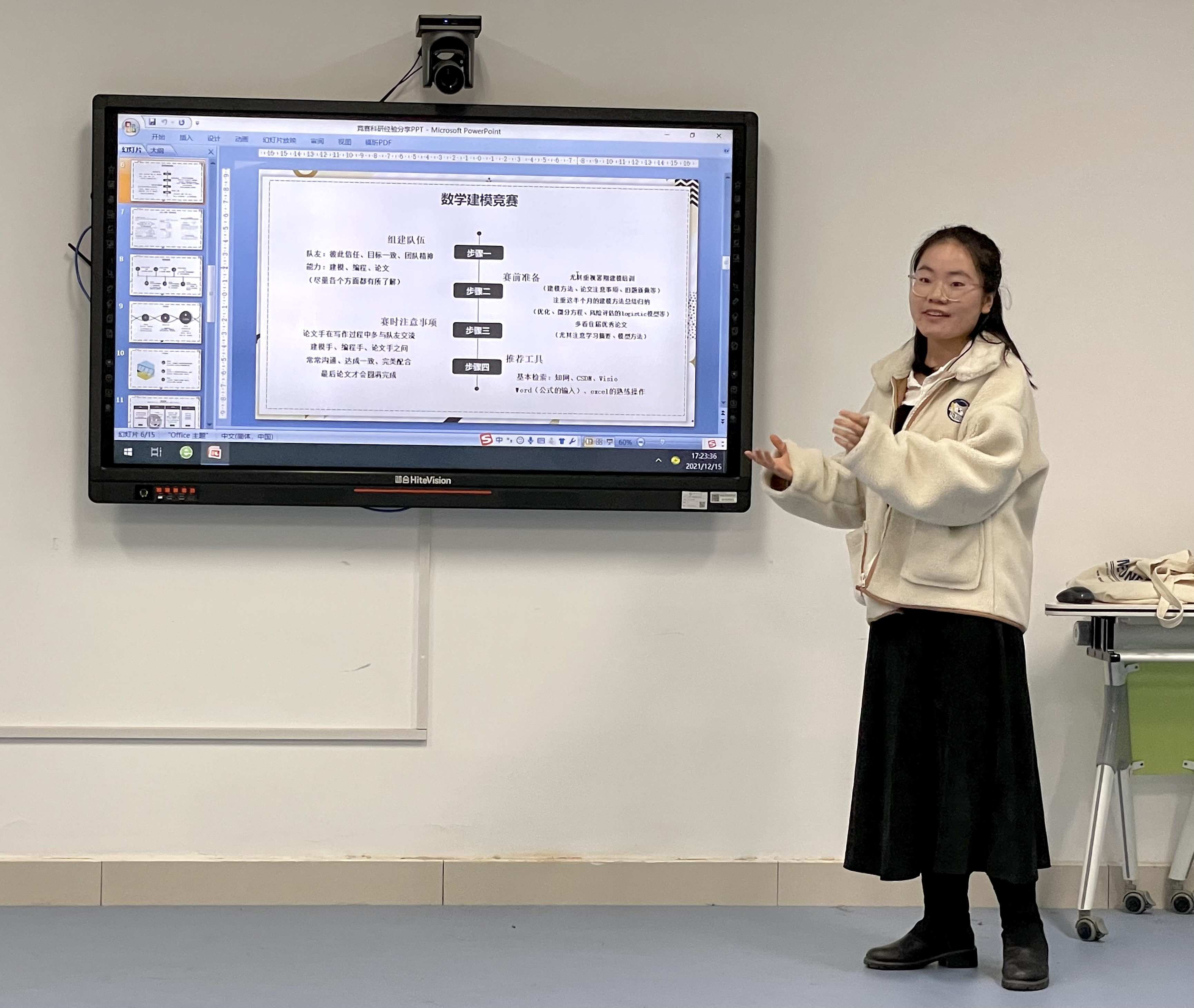 2019级数学与应用数学专业本科生强嘉仪同学,分别从建模竞赛、老员工创新创业竞赛以及数学竞赛这三个项目出发,主要针对建模流程及注意事项、大创项目的准备工作、数学竞赛的备赛经验三个方面进行了详细的介绍和分享,她建议同学们应该在赛中学、多归纳总结,并在最后鼓励大家勇于迈出第一步、告诫同学们在比赛过程中要保持恒心和毅力、重在参与和学习!