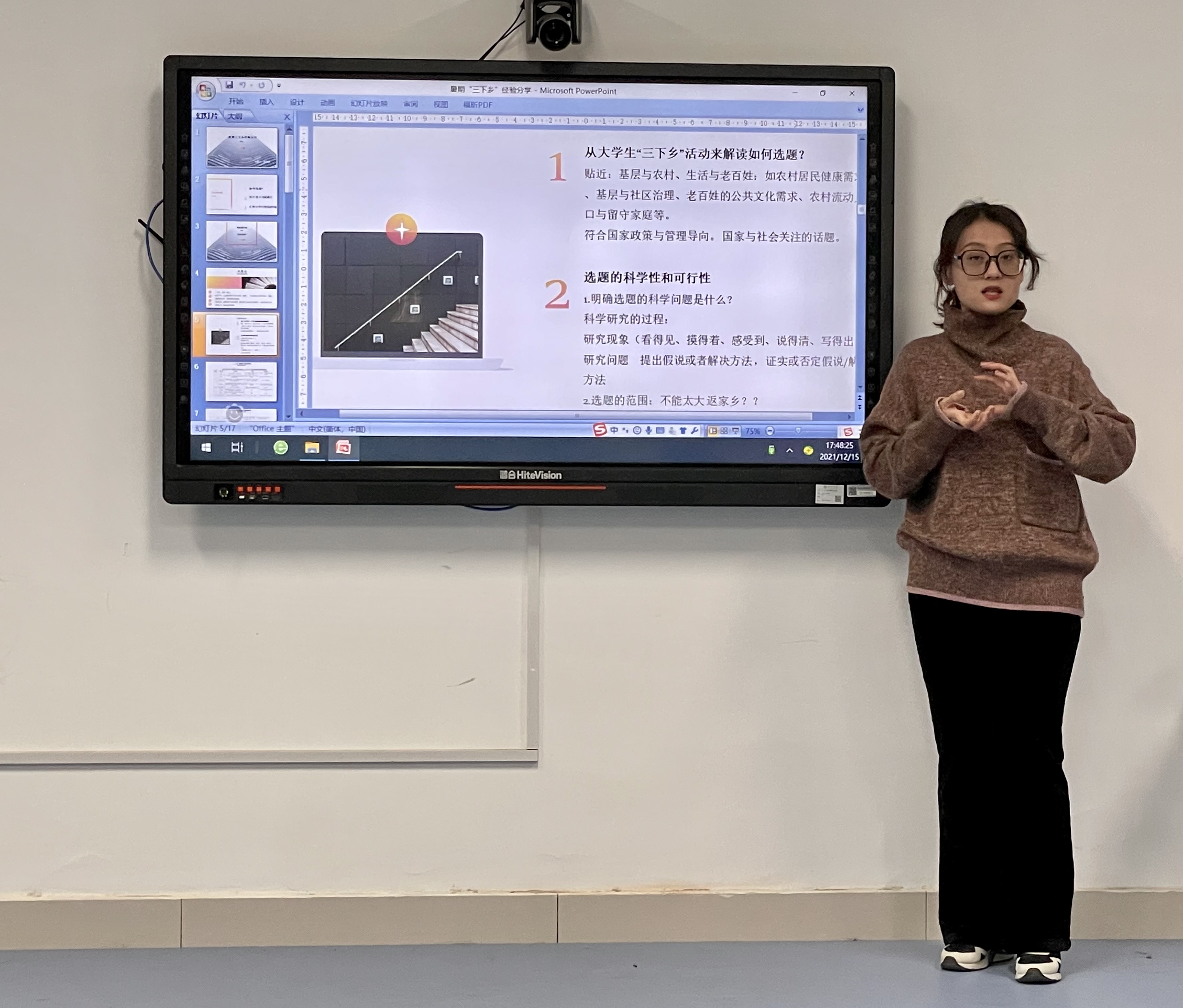 文公司2020级硕士范旭颖同学,以实践活动经验的分享为主,她分别从如何选题、项目计划书的撰写以及实践过程中的注意事项出发,强调选题一定要由点及面,以小见大,要以服务基层、造福社会为宗旨。并建议同学们在实践过程中,多收集素材、多拓宽思路,并及时进行总结,为即将要开展寒假实践的同学们打开了思路。