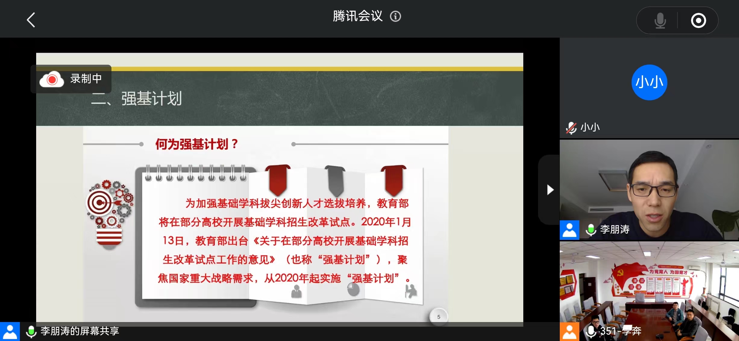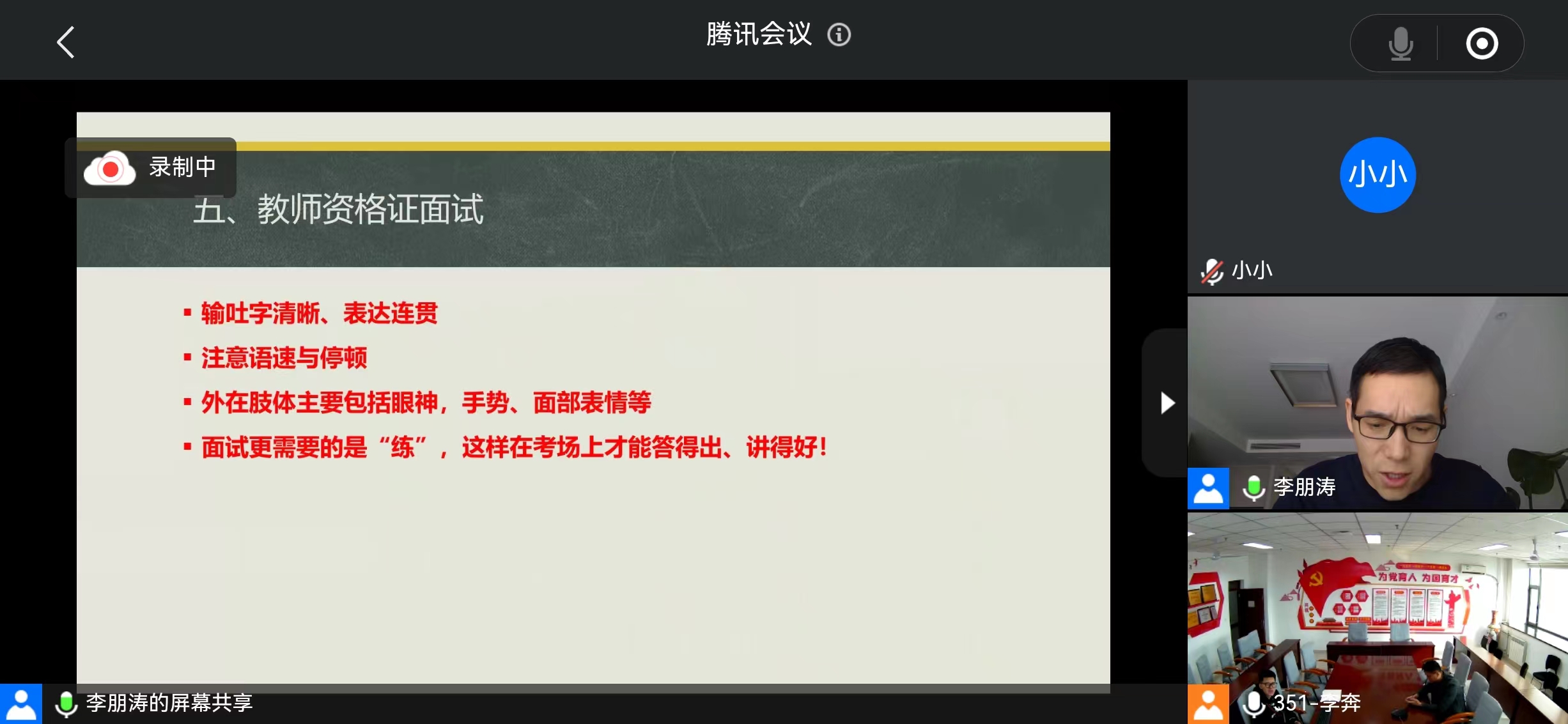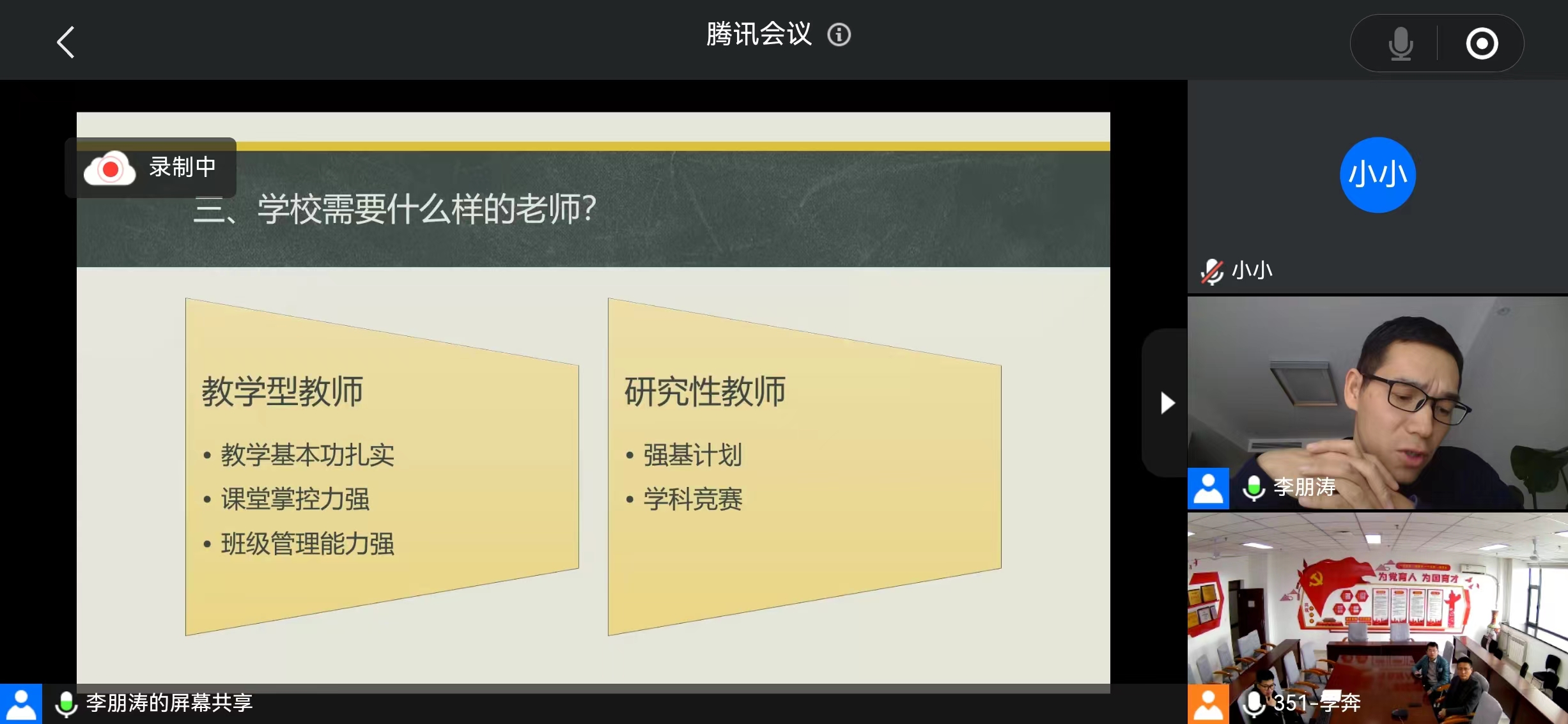 李朋涛老师从名校招生导向、强基计划、中学教师类型、优秀教师必备条件、教团队格证考试面试注意事项等方面进行了深入阐释。他举例分析了高校招生方式的变化与趋势,重点介绍了国家“强基计划”对拔尖创新人才培养、中学教育模式创新、教师从教能力提升的重大作用和实践启发,系统讲解了中学教学型和研究型教师的特点、职业发展路径,交流分享了教育模式的变革、中学教师招聘新趋势、教师职业发展的机遇和挑战等问题。最后,他指出,“基本功”是成为一名优秀教师的必备条件,除了持续强化板书、备课、语言表达,还要在练习做题、练习试讲上下足功夫。