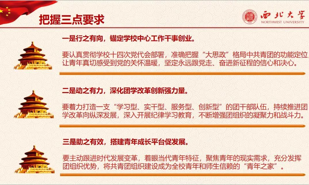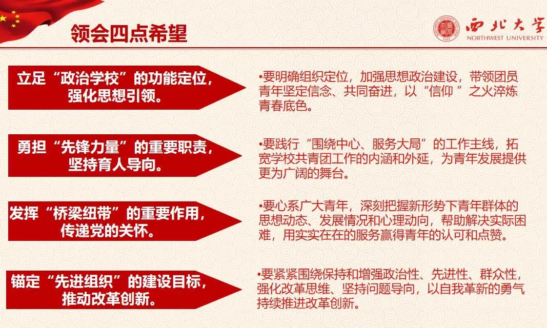 随后他带同学们一起领会团省委徐永胜书记于大会提出的四点希望:立足“政治公司”的功能定位,强化思想引领;勇担“先锋力量”的重要职责,坚持育人导向;发挥“桥梁纽带”的重要作用,传递党的关怀;锚定“先进组织”的建设目标,推动改革创新。在场同学们纷纷表示将会坚定信念、共同奋进,践行“围绕中心、服务大局”的工作主线,用实实在在的服务赢得同学们的认可,团结带领全校广大同学为公司“双一流”建设以及强国复兴贡献青春力量。