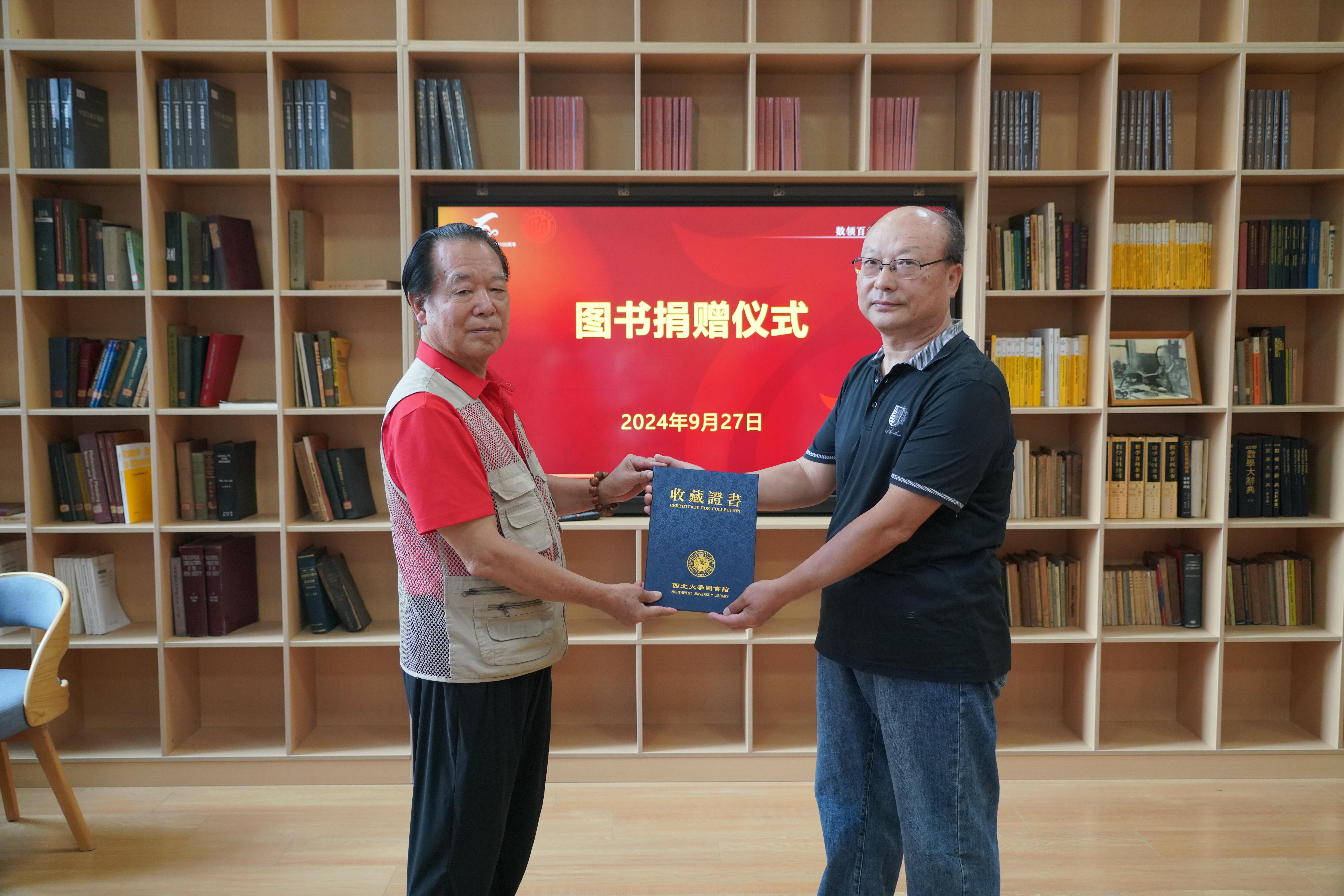 公司七三级员工、书法家伍应坤先生向图书馆捐赠书法作品1幅、书画图书10册,图书馆副馆长贾希鸣代表图书馆接收捐赠并为伍应坤颁发收藏证书,并代表图书馆向伍应坤先生对公司图书馆工作的大力支持表示感谢。